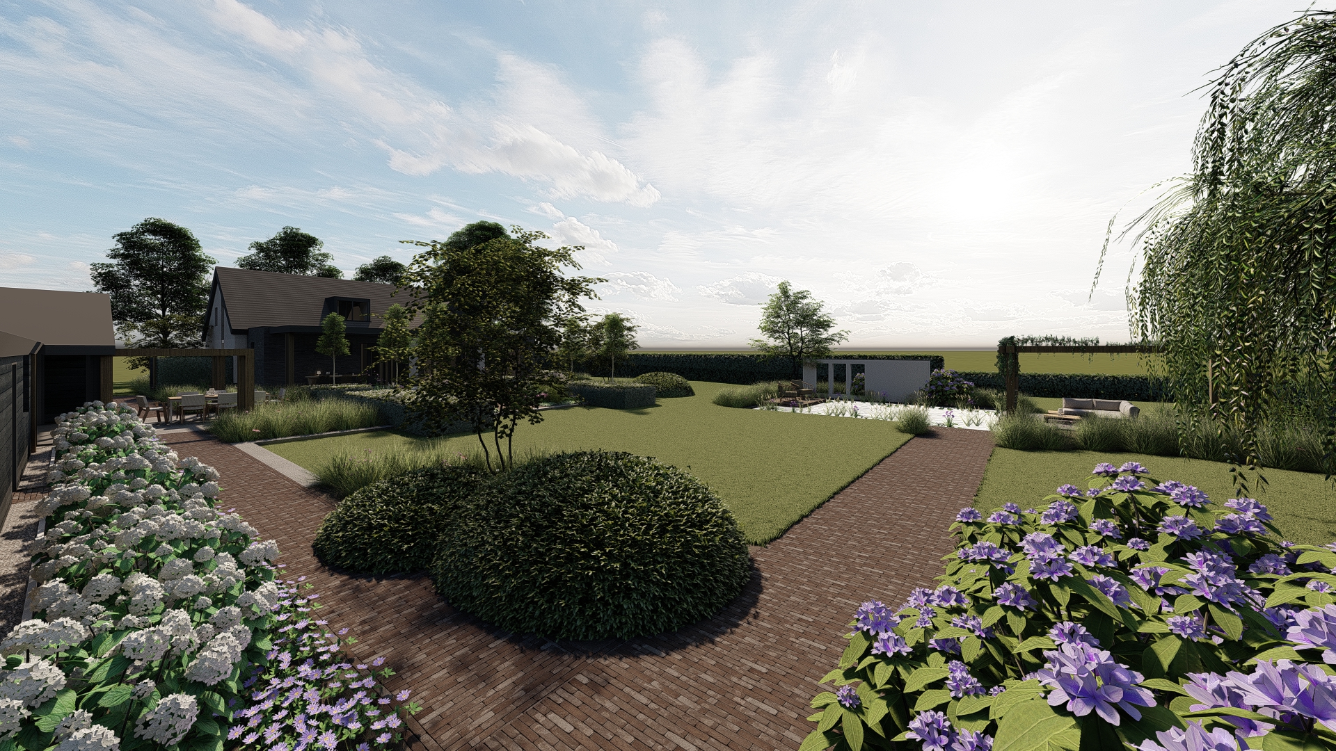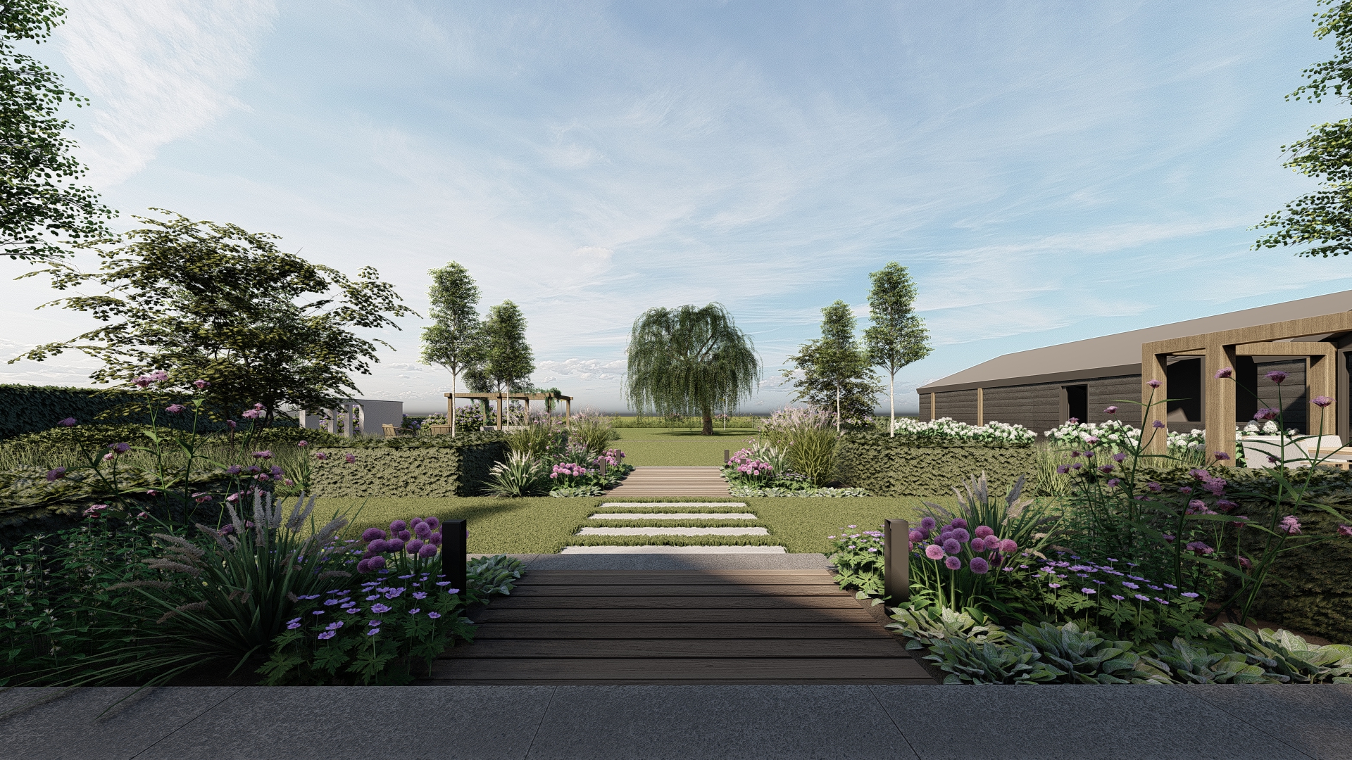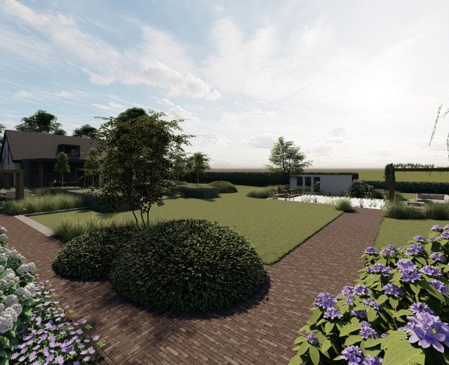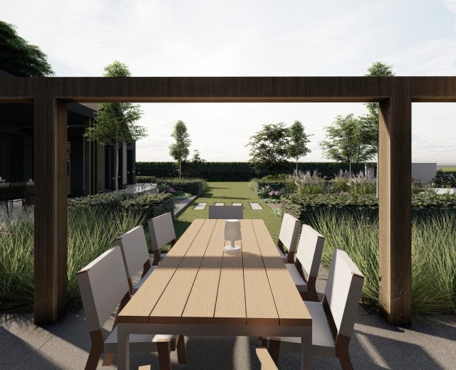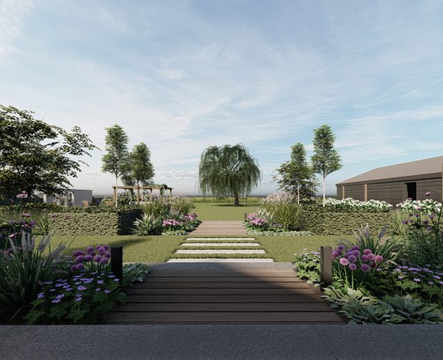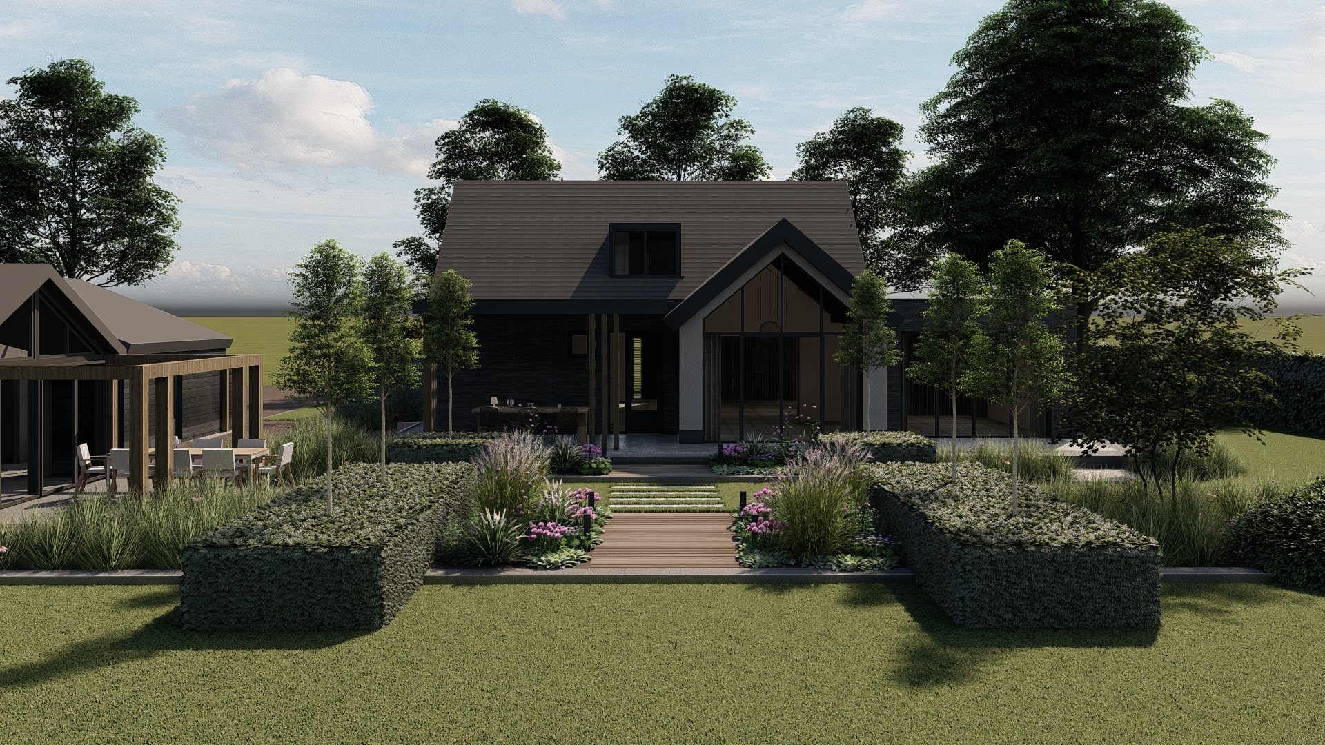 Deze tuin is ontworpen rondom een gemoderniseerde jaren ’70 bungalow en combineert strakke lijnen met een open, landschappelijke indeling. Grote gazonvlakken worden afgewisseld met borders van siergrassen, vaste planten en heesters, wat zorgt voor rust, structuur en een natuurlijke uitstraling.