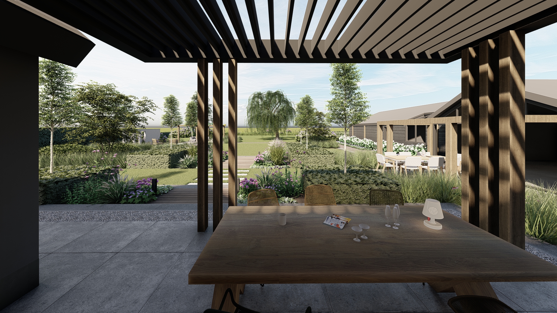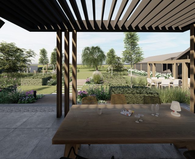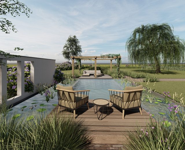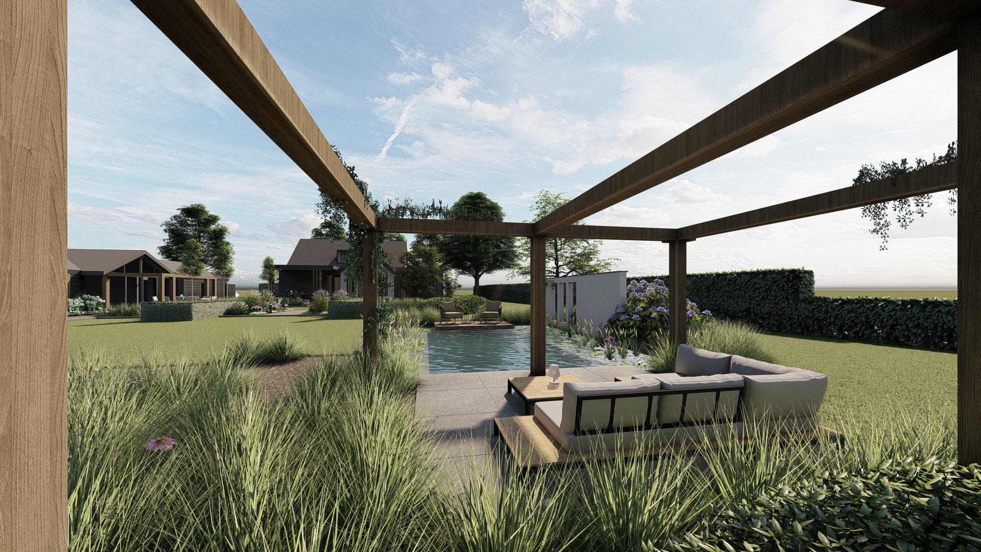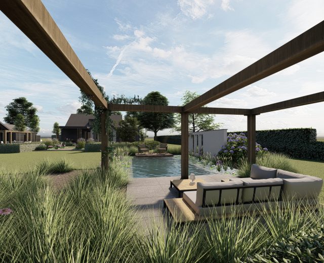 In de tuin zijn meerdere verblijfsplekken opgenomen, waaronder een houten pergola met zit- en eethoek, een lamellenoverkapping en een zwemvijver met vlonders en staptegels. Door de open zichtlijnen, zachte beplanting en het gebruik van natuurlijke materialen sluit de tuin logisch aan op de woning en het omliggende landschap.