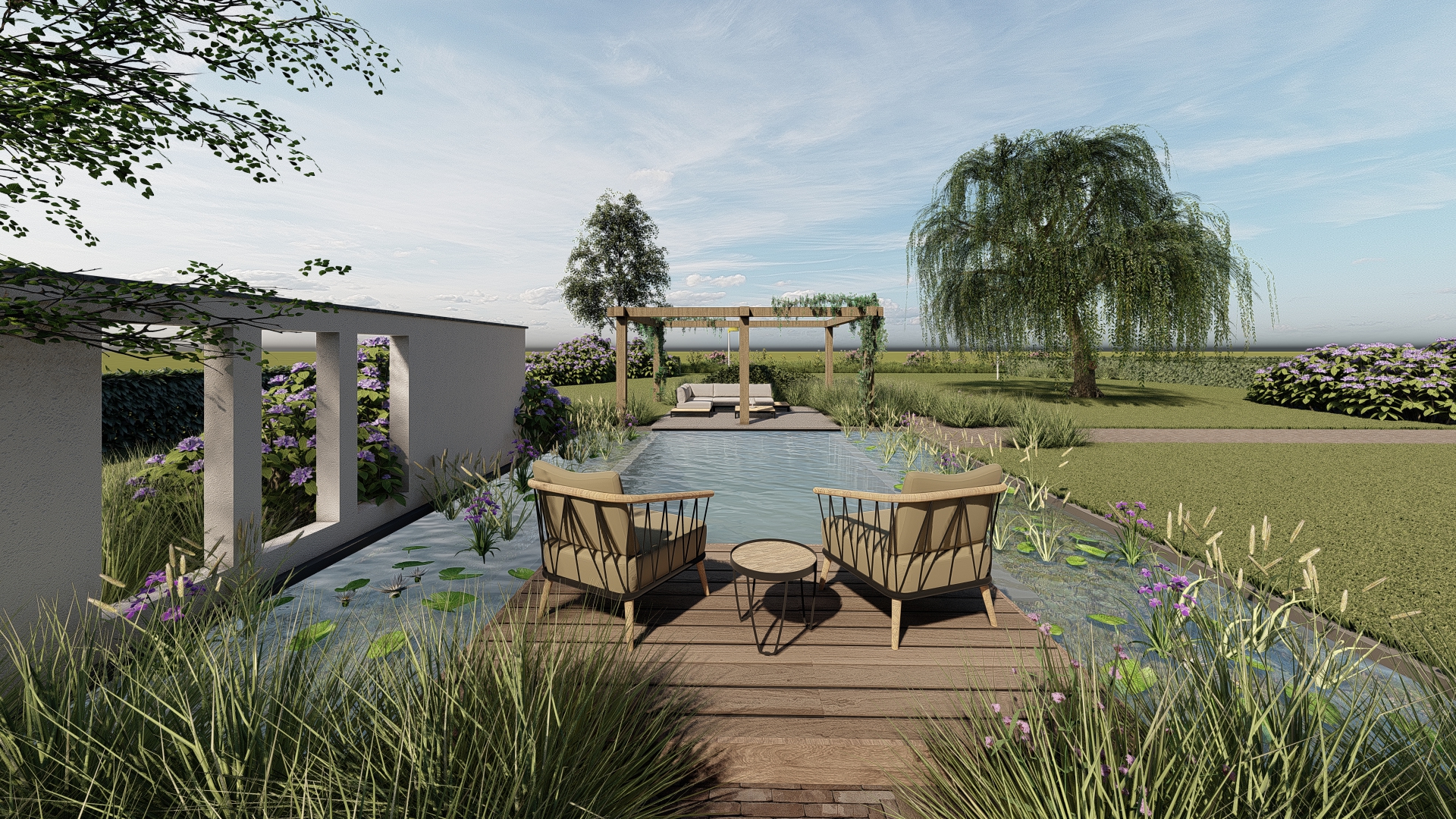 Moderne landschappelijke tuin met pergola en zwemvijver