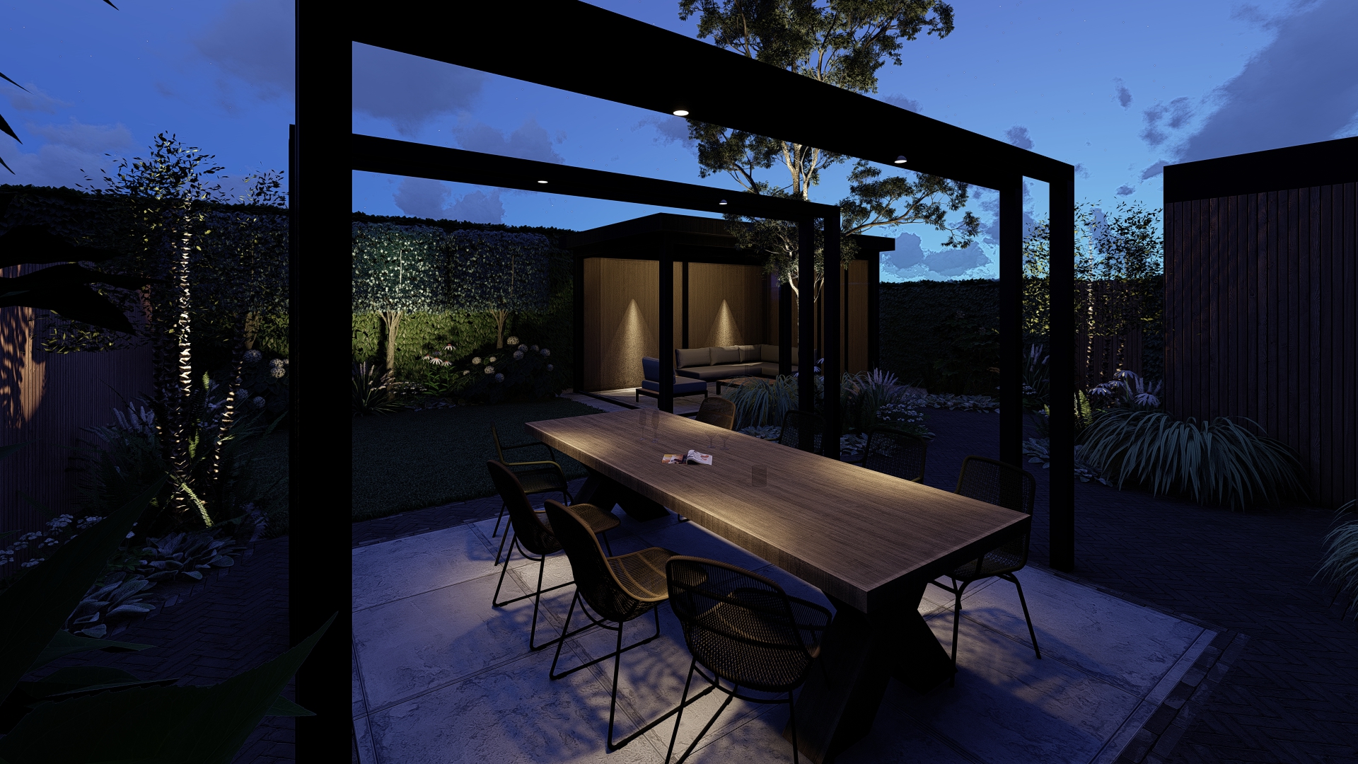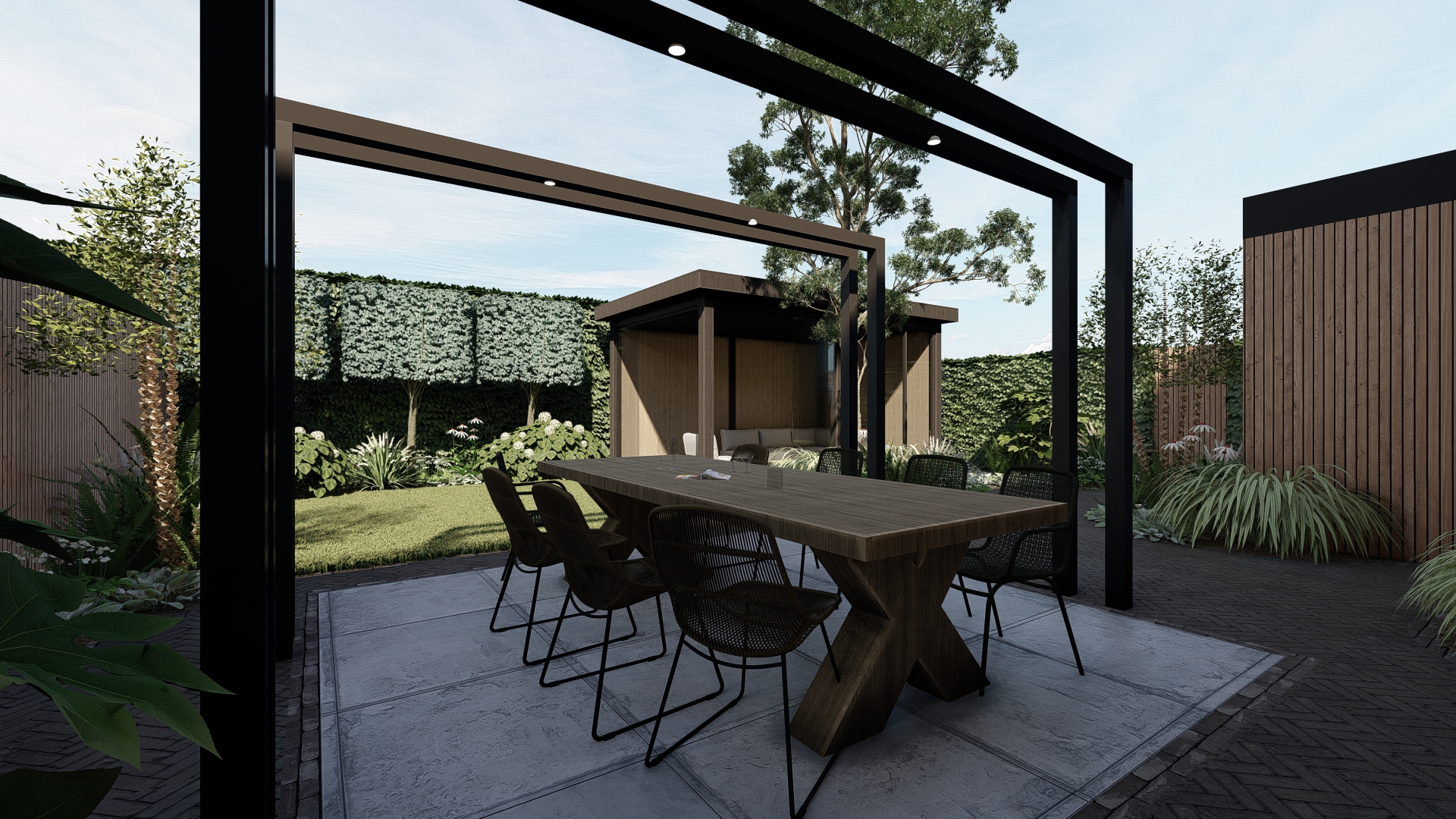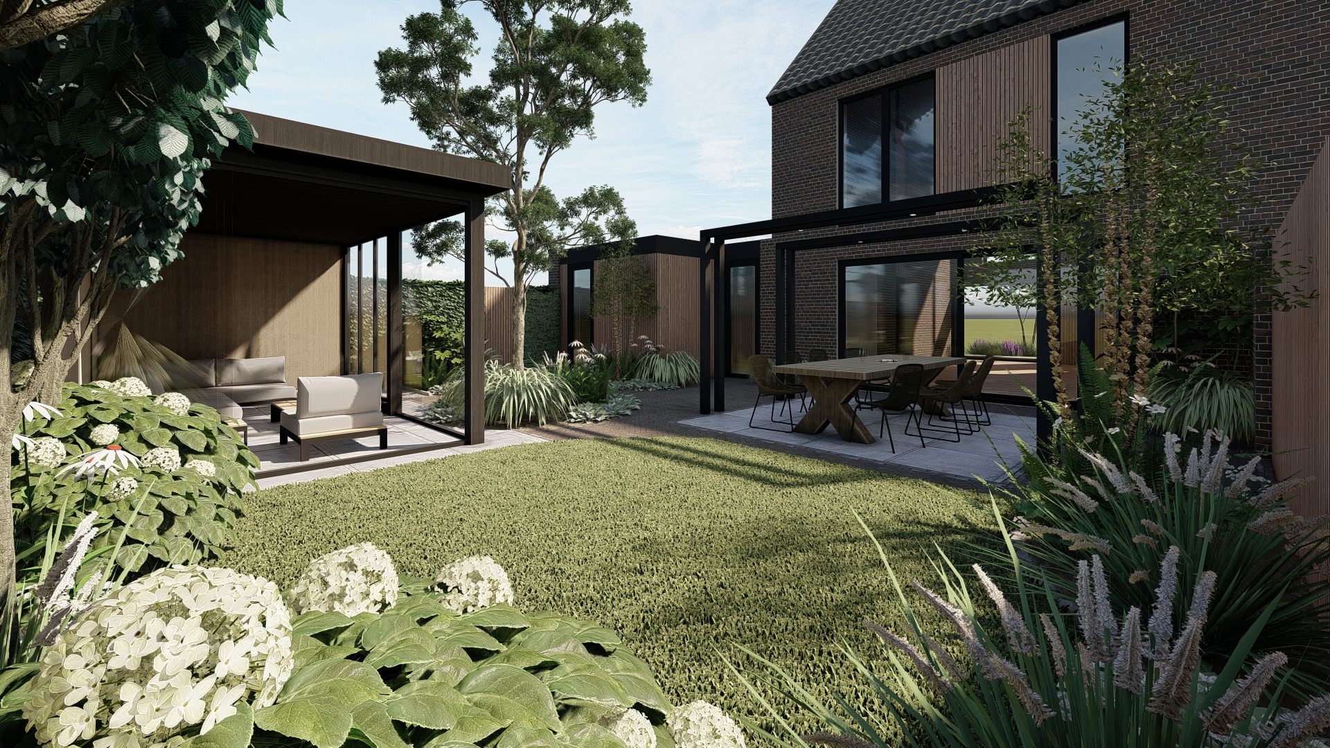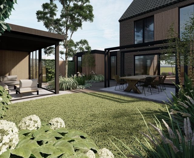Natuurlijke tuinen met organische lijnen en een rustige, groene invulling. De tuin is opgebouwd uit ruime terrassen, paden en duidelijke zichtlijnen tussen woning en de tuin. Overkappingen en zitplekken zijn geïntegreerd in de architectuur en zorgen voor beschutte plekken in de tuin.