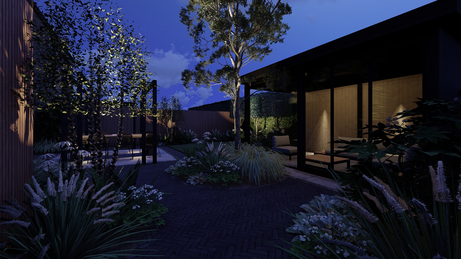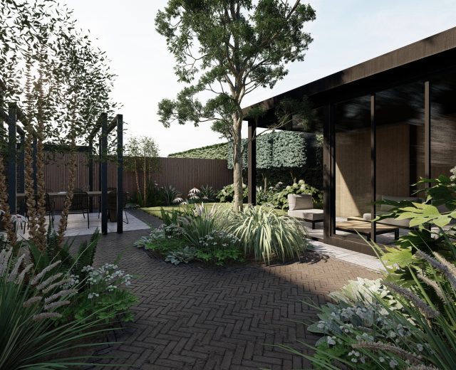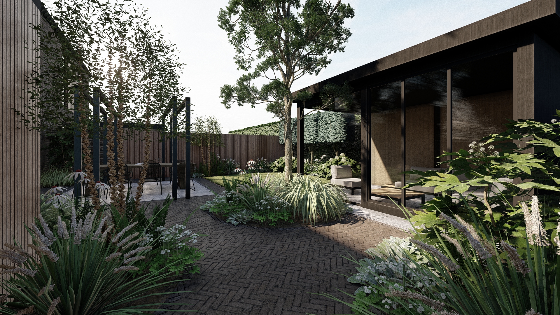 De beplanting verzacht de strakke vormgeving met wuivende siergrassen, vaste planten en meerstammige bomen. Hagen en groene wanden zorgen voor privacy en een groene achtergrond, terwijl bloeiende borders het hele jaar door structuur en kleur geven.