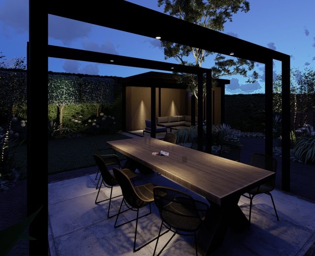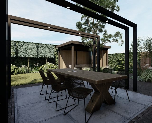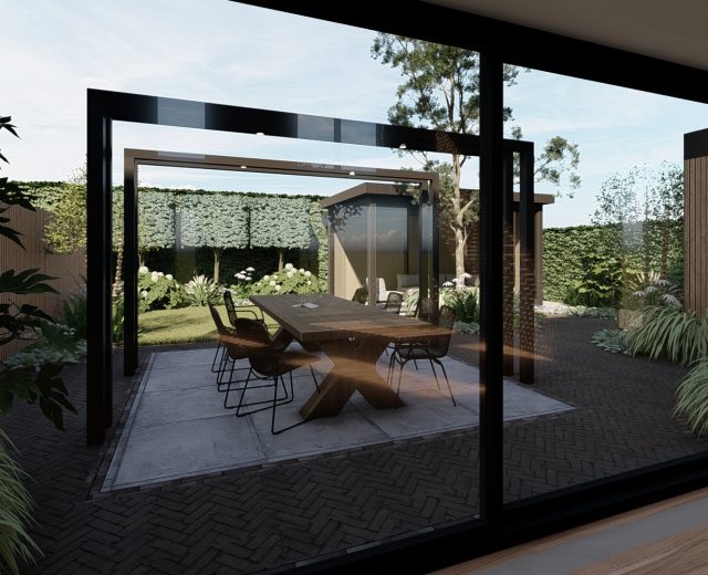 Deze tuin combineert moderne architectuur met een natuurlijke, onderhoudsvriendelijke beplanting en is ontworpen voor comfortabel buitenleven met een rustige uitstraling.