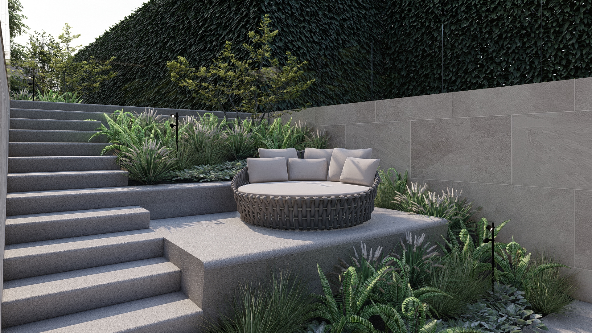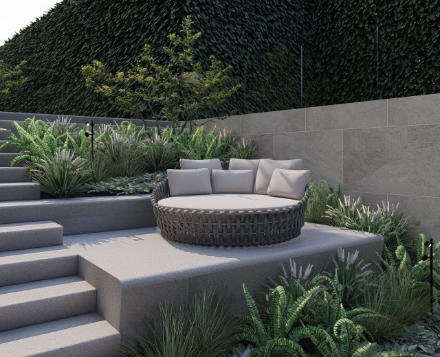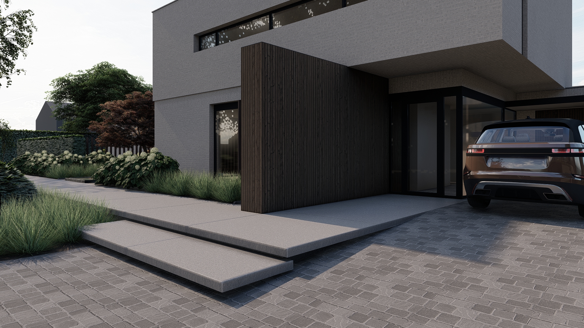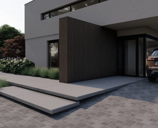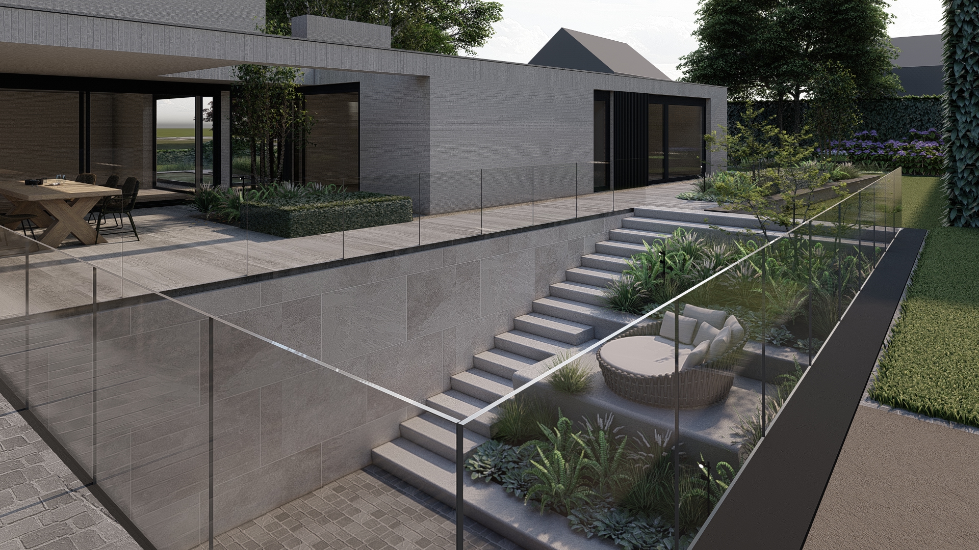 Deze villatuin is ontworpen als een strak en architectonisch verlengstuk van de woning. Hoogteverschillen, brede trappen en duidelijke niveaus zorgen voor een heldere ruimtelijke opbouw en sterke zichtlijnen. Grote vlakken in natuursteen en beton vormen de basis, gecombineerd met een ingetogen palet aan materialen.