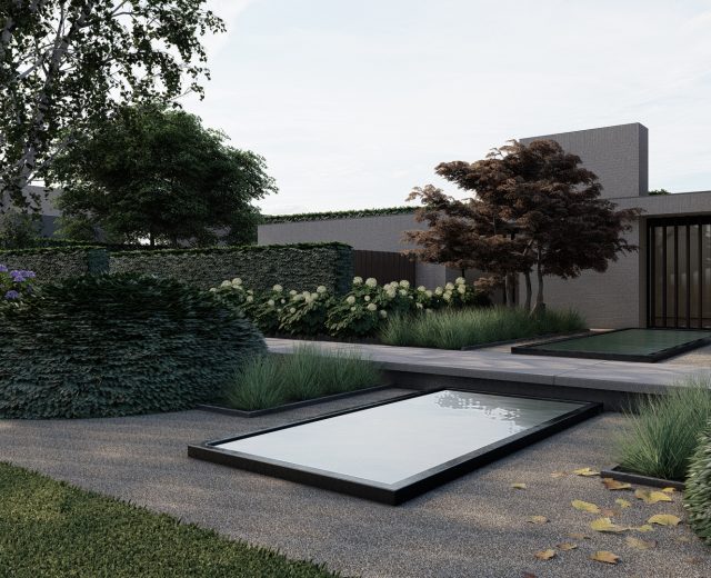 De zitkuil is verdiept aangelegd en vormt een beschutte verblijfsplek binnen het geheel, zonder de openheid van de tuin te doorbreken. Beplanting is toegepast in rustige massa’s met siergrassen, varens en structurele heesters, waardoor het ontwerp groen blijft zonder druk te worden. Water- en spiegelvlakken versterken de rust en sluiten aan op de strakke lijnen van het ontwerp.
